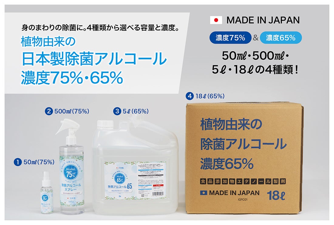 完全特注のオリジナルグッズの企画生産、およびウイルス対策グッズメーカー事業を手がけるアイグッズ株式会社(本社:東京都渋谷区)では、今まで75%の除菌アルコールだけを扱ってきましたが、60%未満の製品追加の希望をいただき、今回2つのアルコール濃度を選べるような形でリニューアルを図りました。2種類のアルコール濃度、4種類のサイズから、利用目的・使用シーンに合わせて製品をご選択いただけるようになりました。