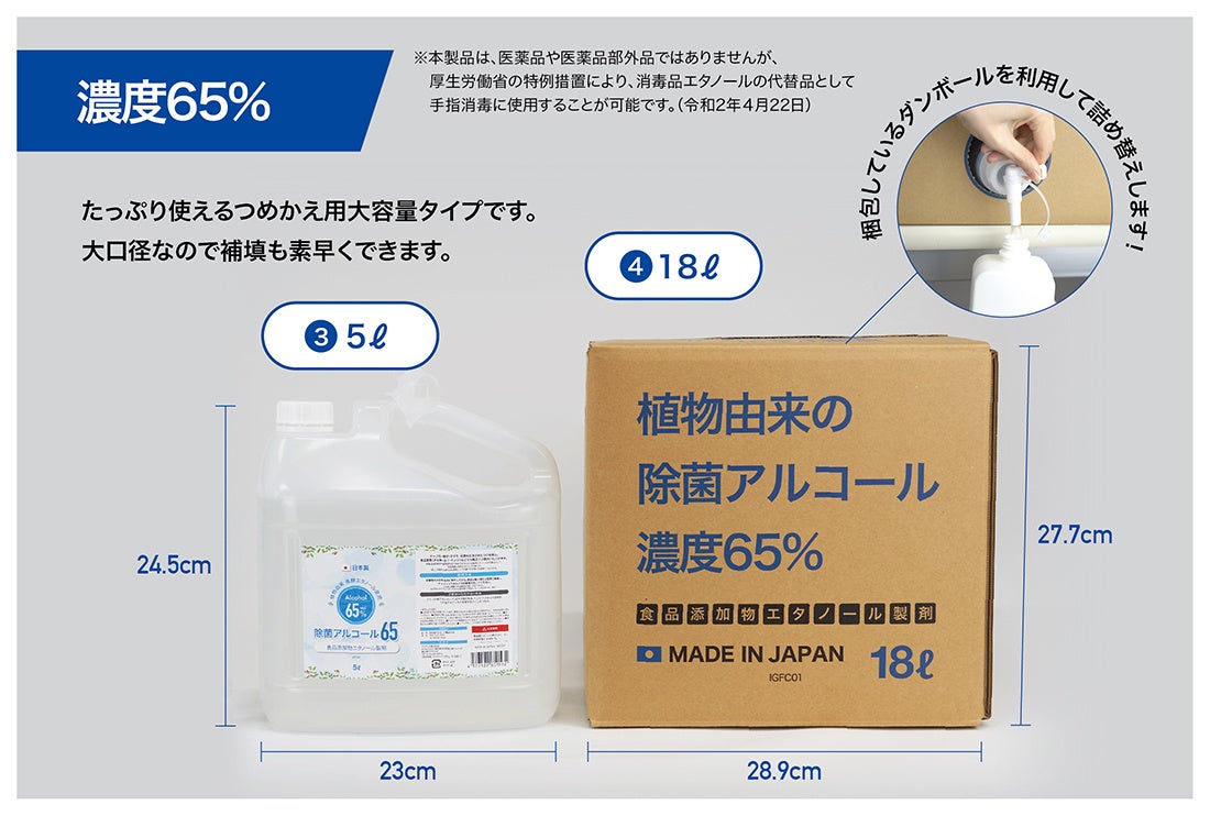 大容量タイプは、詰替や備蓄用に便利。除菌液の使用頻度が高い今、オフィスや飲食店などで重宝される製品となっています。