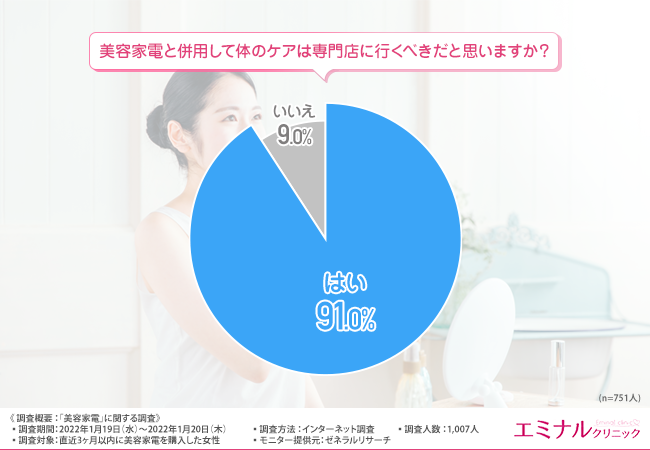 そこで、「美容家電と併用して体のケアは専門店に行くべきだと思いますか?」と質問したところ、9割以上の方が『はい(91.0%)』と回答しました。