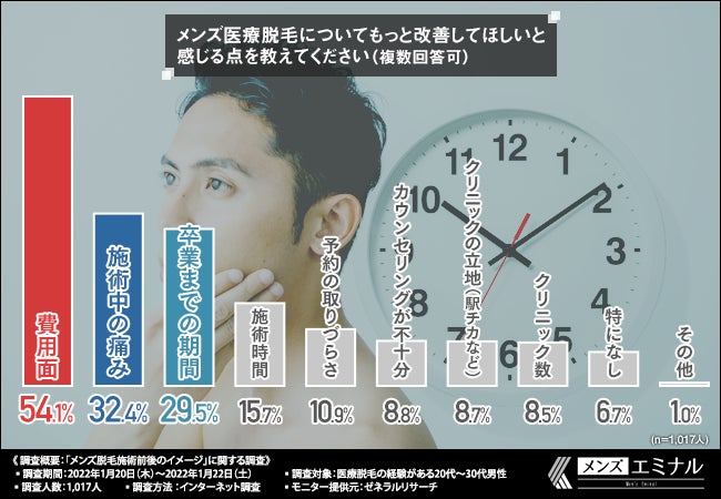 手入れの手間もなくなり、多くの方が脱毛をしてよかったと思っていることがわかりましたが、メンズ医療脱毛について改善して欲しい点はあるのでしょうか?