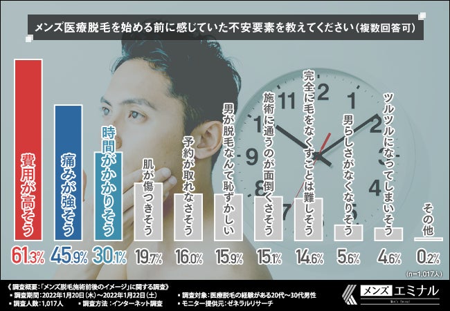 そこで、「メンズ医療脱毛を始める前に感じていた不安要素を教えてください(複数回答可)」と質問したところ、『費用が高そう(61.3%)』と回答した方が最も多く、次いで『痛みが強そう(45.9%)』『時間がかかりそう(30.1%)』と続きました。