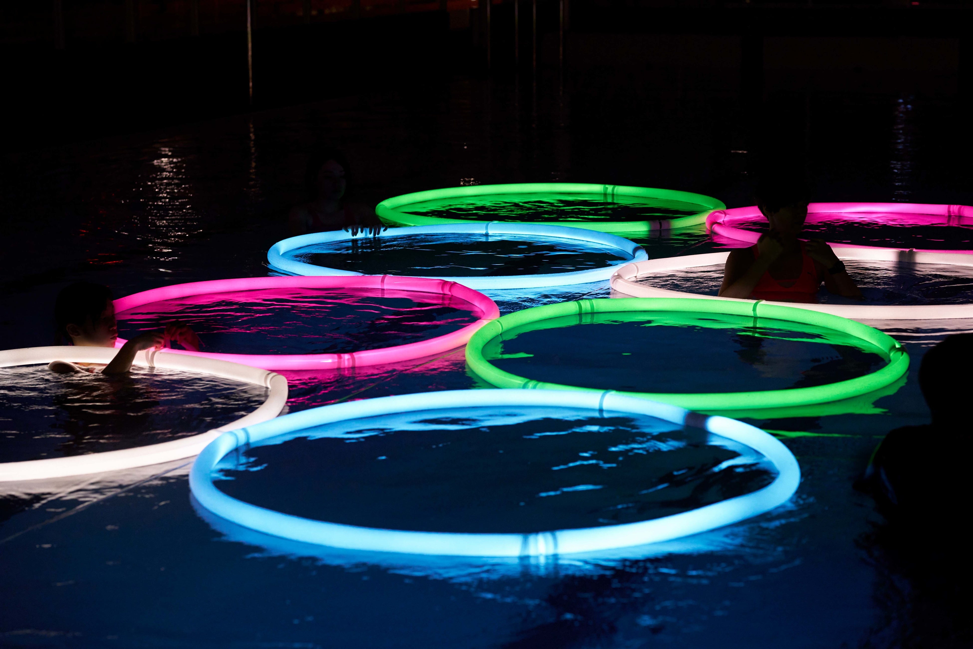 一般的なプールに、直径2mの光るループを設置し、一つ一つが個人向けのパーソナルなダンスフロアに変わります。光るループの中で、DJがプレイする音楽に合わせて、プールでは珍しい縦ノリも交えながら、目、耳、体をフルに使って、楽しんでいただきます。