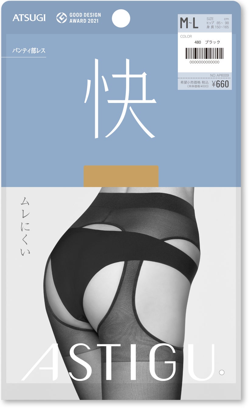 パンティ部レスでムレにくい【快】。パンティ部が生地で覆われていないのでムレにくく、お手洗い時も楽で時短に繋がる、快適・便利なストッキング。