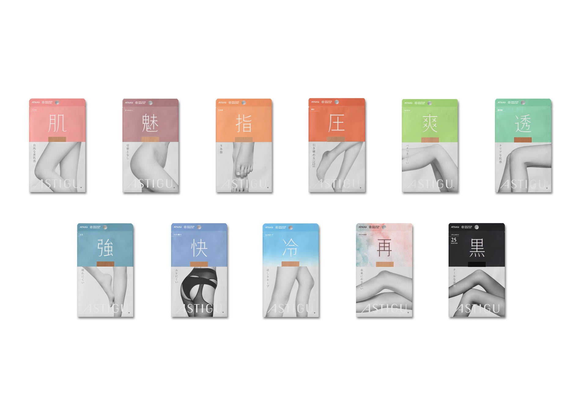 アスティーグは、ストッキングを求める全ての方々にはいていただけるよう、サイズ・カラーを豊富に取り揃え、今の生活者が必要とする11種類のラインアップに刷新して展開いたします。アスティーグのアイデンティティである漢字一文字の商品名はそのままに、製品とラインアップを新たにしました。