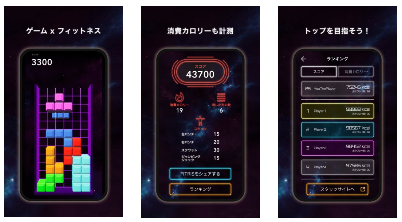 体を動かしてブロックを操作して遊ぶ、アスレチックe-Sportsのエンタメ型フィットネスアプリ。ハイスコアや消費カロリーで家族や友達と一緒に競い合ったり、過去の運動履歴をチェックしながら過去の自分と戦ったり、楽しみながら運動ができるスマホアプリです。