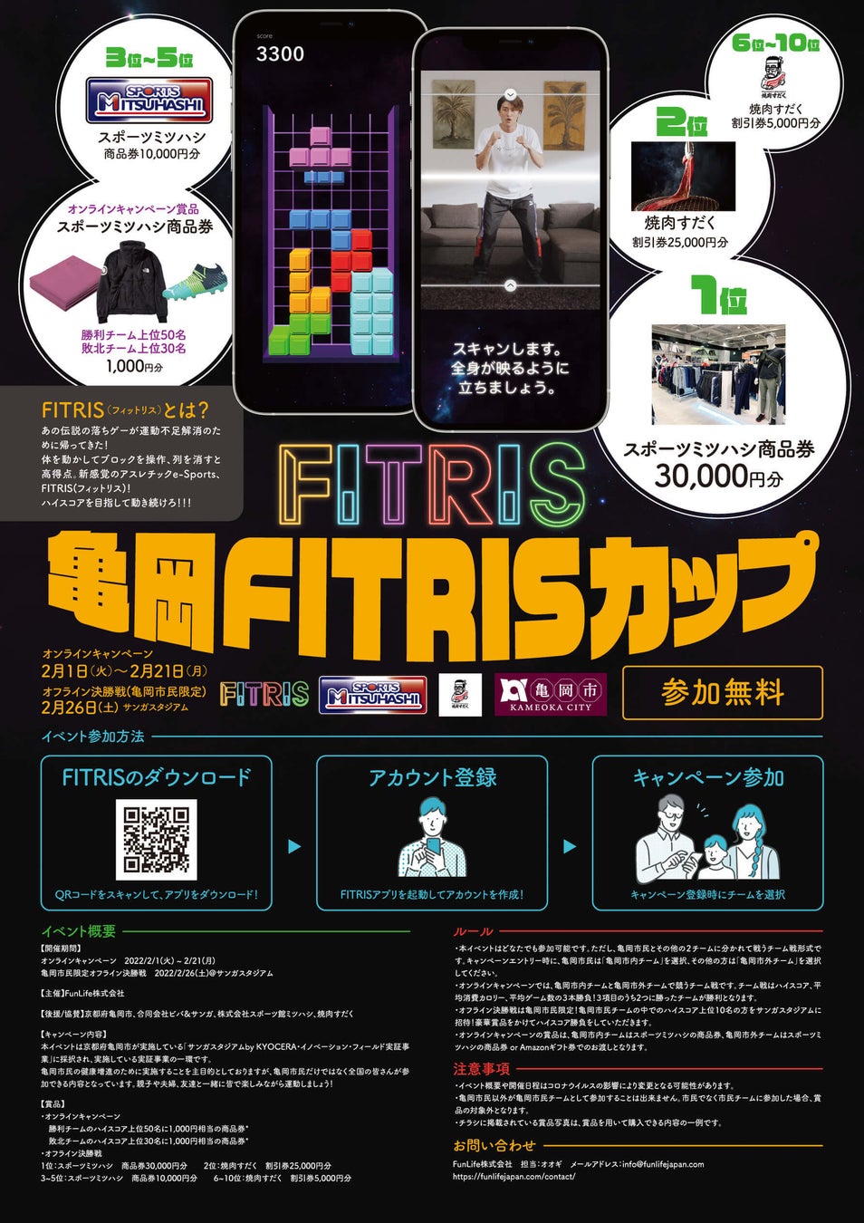 FunLife株式会社(代表取締役CEO:田巻 富士夫、代表取締役COO:黄木 桐吾、以下FunLife)が展開するアスレチックe-Sportsのエンタメ型フィットネスアプリ「FITRIS」は、京都府亀岡市と連携して参加者の運動習慣定着化を目指すオンライン/オフラインイベントを開催します。