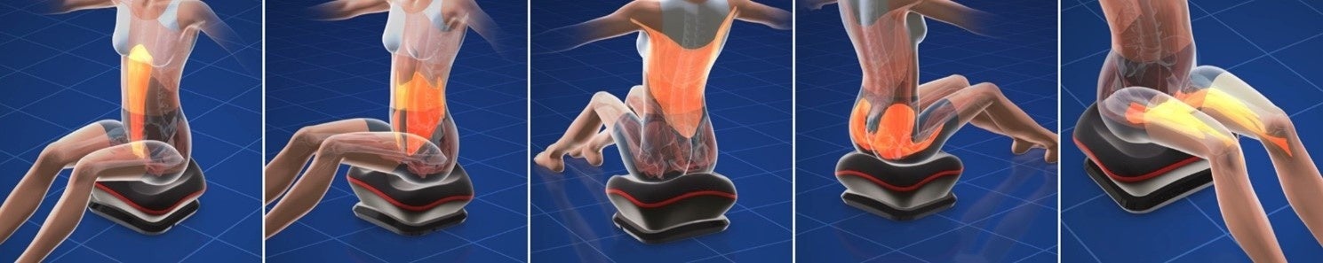 前後・上下・左右に波打つように3D回転をする座面に座り、バランスをとることで「腹直筋」「腹斜筋」「広背筋」「中臀筋」「内転筋」を刺激します。骨盤は上半身と下半身の起点になる部位なので、骨盤を中心に不規則に変化する動きに対し、姿勢を保持するためにお腹や背中などの広範囲の体幹の筋肉を一気に刺激します。
