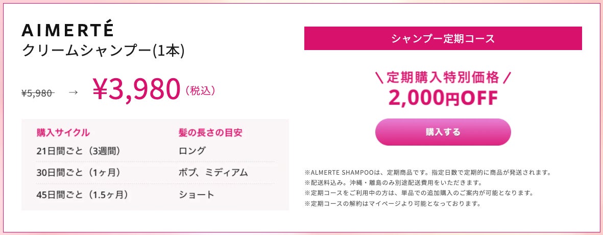 お客様の髪の長さやボリュームによってシャンプーの消費量が異なることを考慮し、配送サイクルに3パターンの間隔を設けました。また、解約する際の期間の縛りもなく、ECサイト内のマイページより簡単に解約が可能となります。マイページでは解約の他に、配送サイクルの変更や一時休止、追加単品購入など、定期便のデメリットとしてよくある「あと少しで足りなくなってしまった」や「使いきれずに溜まってしまった」などといった消費者の悩みを解消させる設計となっております。