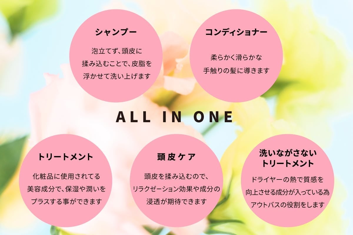 AIMERTÉ(エメルテ) クリームシャンプーは、泡立てが必要ないクリームタイプのオールインワンシャンプーです。シャンプーだけではなく、コンディショナー、トリートメント、ヘッドスパ(頭皮ケア)、流さないトリートメントと、5つもの役割も果たすので、洗うとヘアケアを同時におこなえるメリットがあります。本来これらのヘアケアを、それぞれおこなう必要があり、髪の長い女性にとっては時間のかかる面倒なことだと思います。