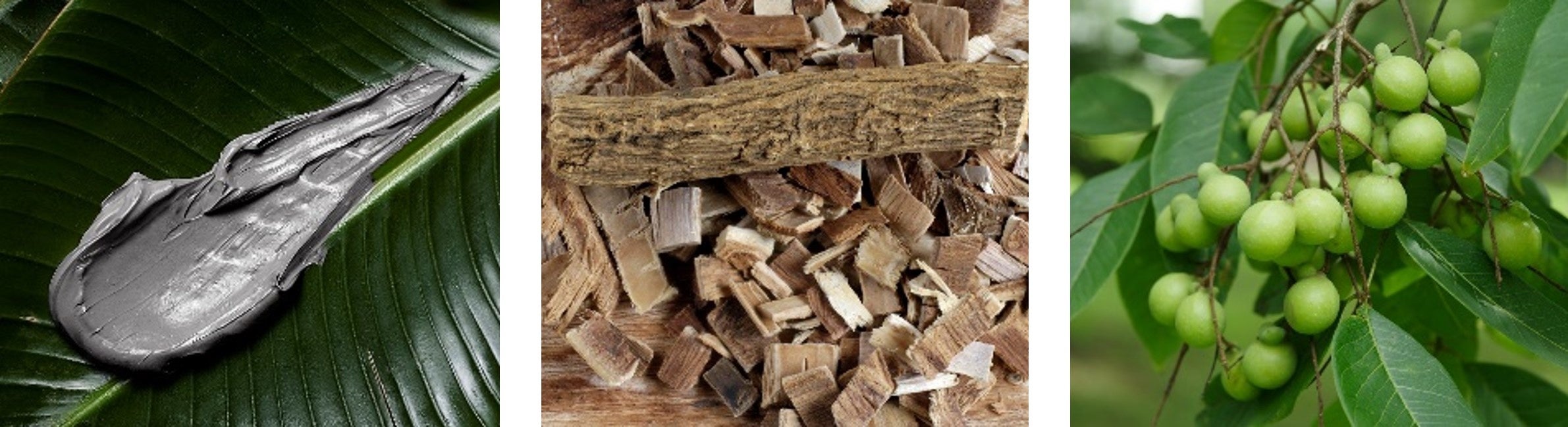 (画像左から)ベントナイト・2種の植物エキス:キラヤ樹皮エキス・ムクロジエキス