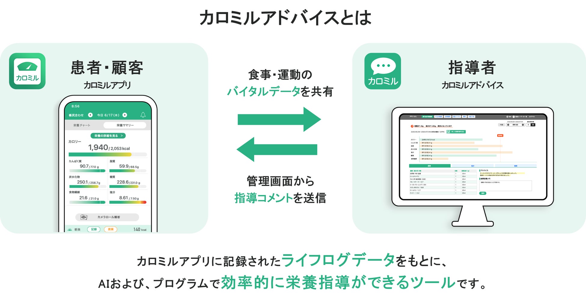 指導対象者(顧客)の「カロミル」アプリと連携し、食事の栄養指導がすべてオンライン上で完結できる、指導者向けのウェブツールです。指導対象者(顧客)の食事データの記録・蓄積が自動化されるだけでなく、AI が食事内容を自動で解析・栄養価計算し、指導者の栄養価計算など食事指導にかかる手間が大幅に削減されます。