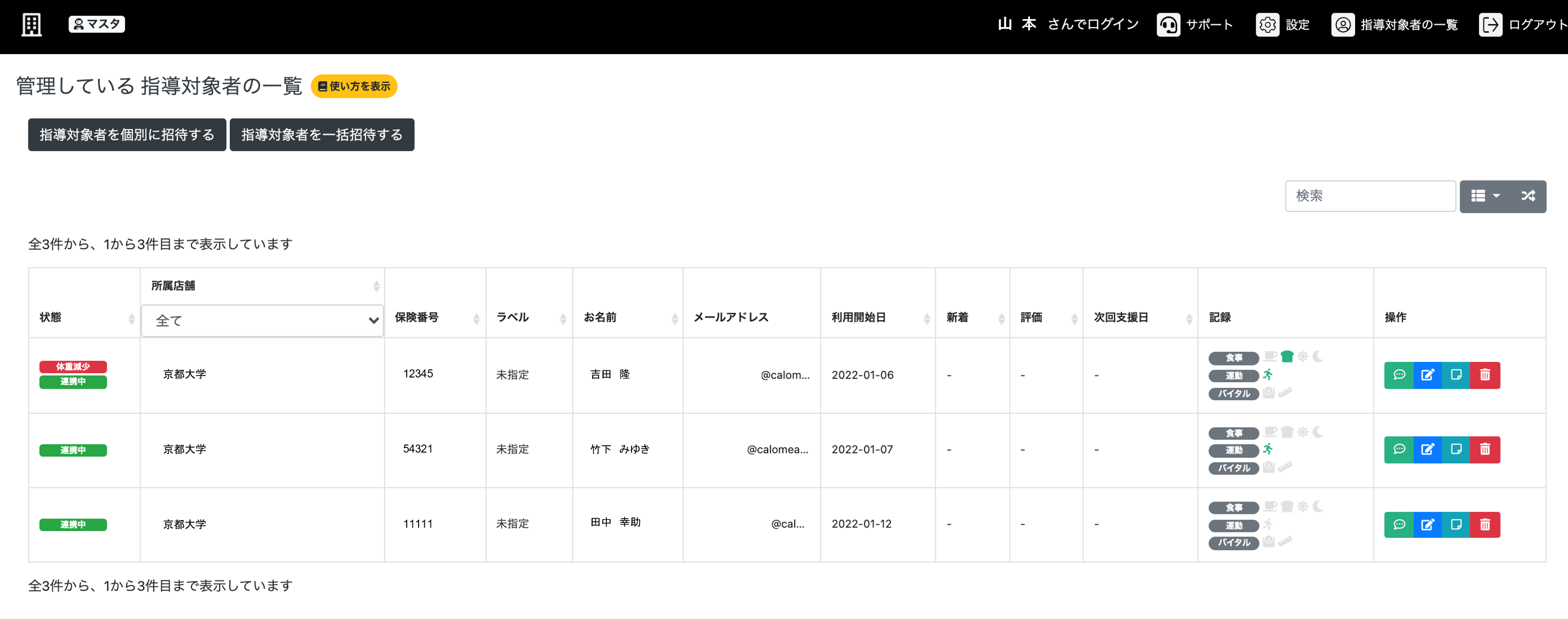 指導対象者(顧客)の「カロミル」アプリと連携し、食事の栄養指導がすべてオンライン上で完結できる、指導者向けのウェブツールです。指導対象者(顧客)の食事データの記録・蓄積が自動化されるだけでなく、AI が食事内容を自動で解析・栄養価計算し、指導者の栄養価計算など食事指導にかかる手間が大幅に削減されます。