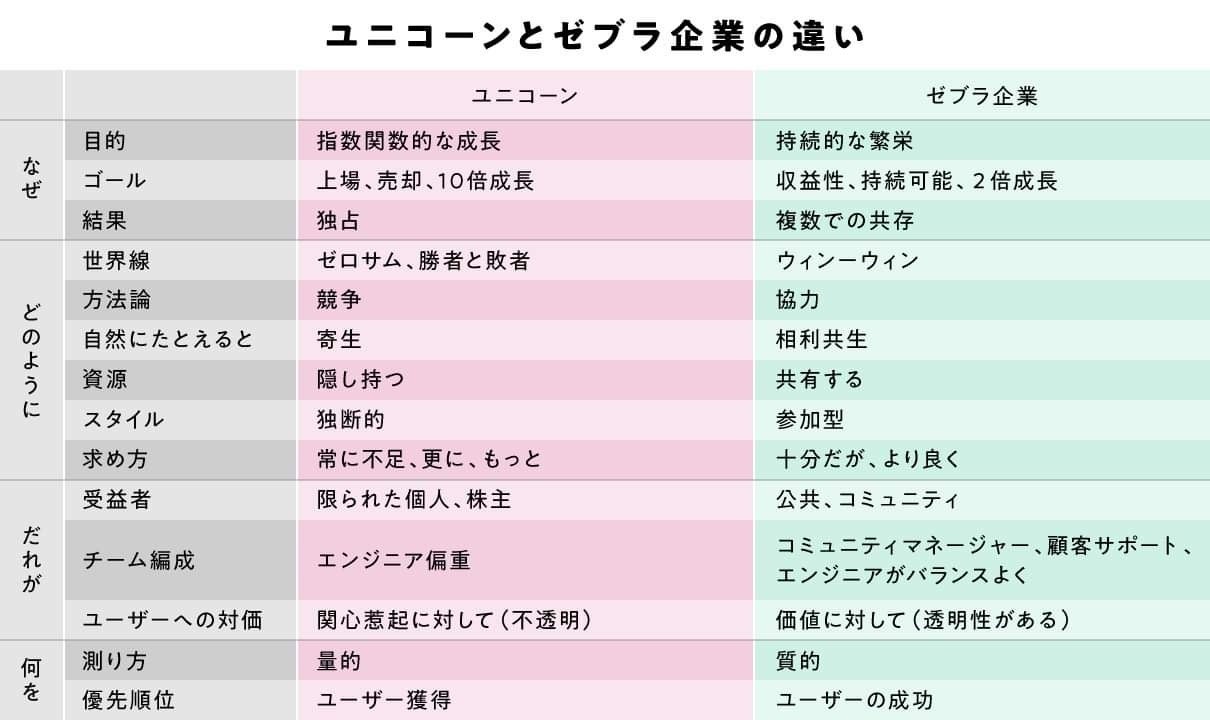 Zebras Uniteでは「Unicorn startups」と「Zebras」の違いを下記のように整理しています。
