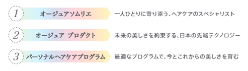また、オージュアでは「オージュアソムリエ制度」を採用。ケア知識や技術、お客様とのコミュニケーションのサポートを行うことで、ヘアケアに関する知販売上向上に貢献しています。お客様一人ひとりの地肌や髪の状態に合わせて複数ラインを使い分けることができるため、ヘアケアへの関心が高い方から多くの支持を得ています。