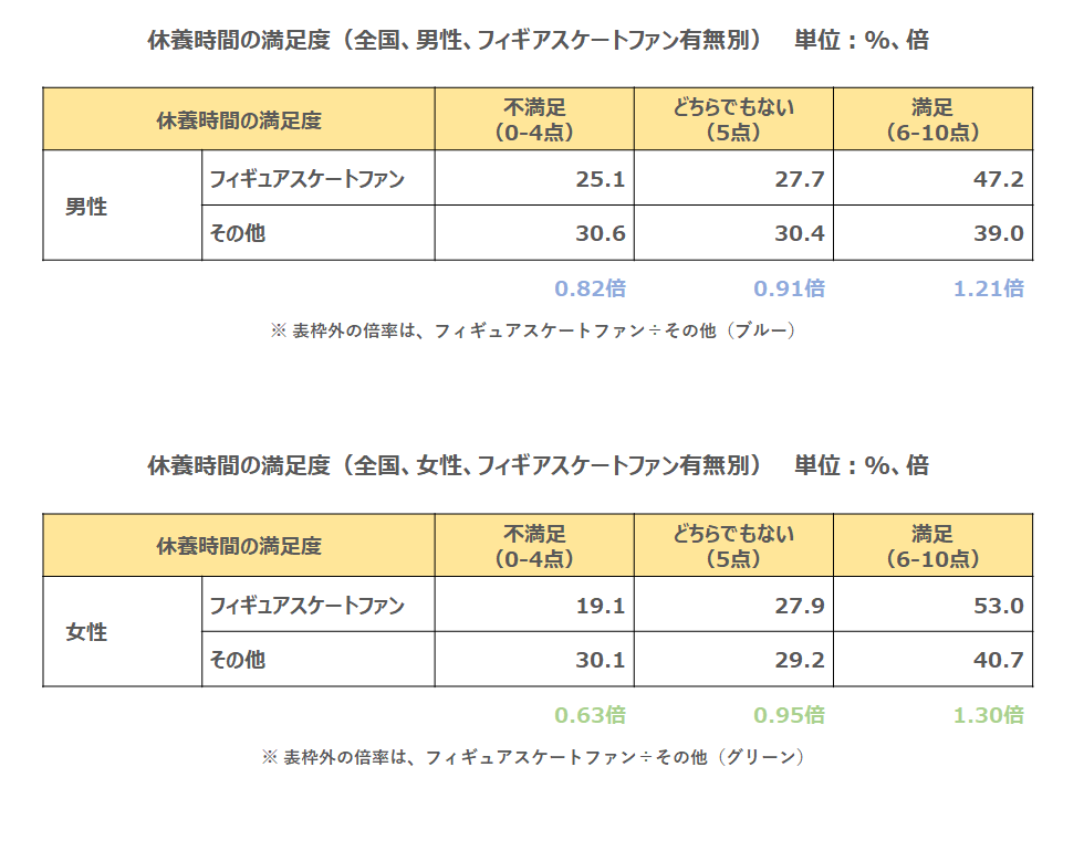 フィギアスケートの男性ファンの休養時間の満足度は、47.2%、女性ファンは53.0%という結果に。ファン以外の方と比較すると男性で1.21倍、女性で1.30倍ということがわかりました。