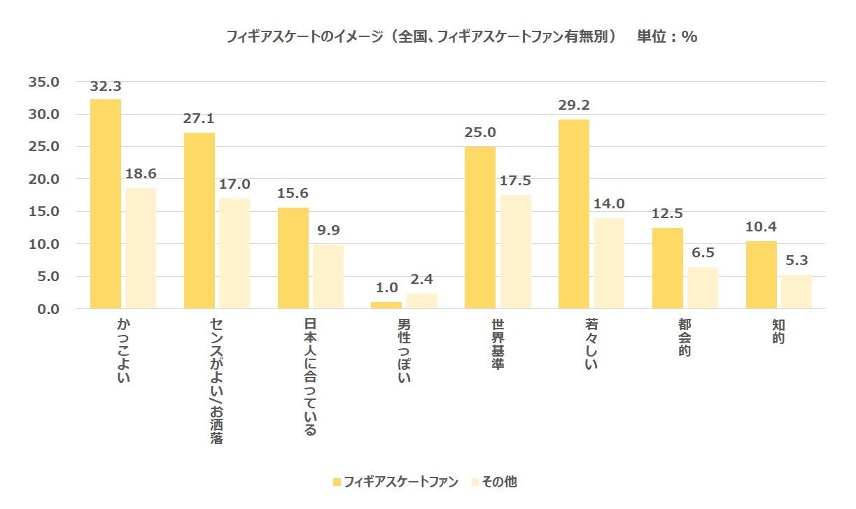 さらにフィギュアスケートのイメージ調査を行った結果、全体で最も多かったのが「かっこ良い」という結果に。次いで、フィギュアスケートファンは、「若々しい」、ファン以外の方は「世界基準」という結果になりました。