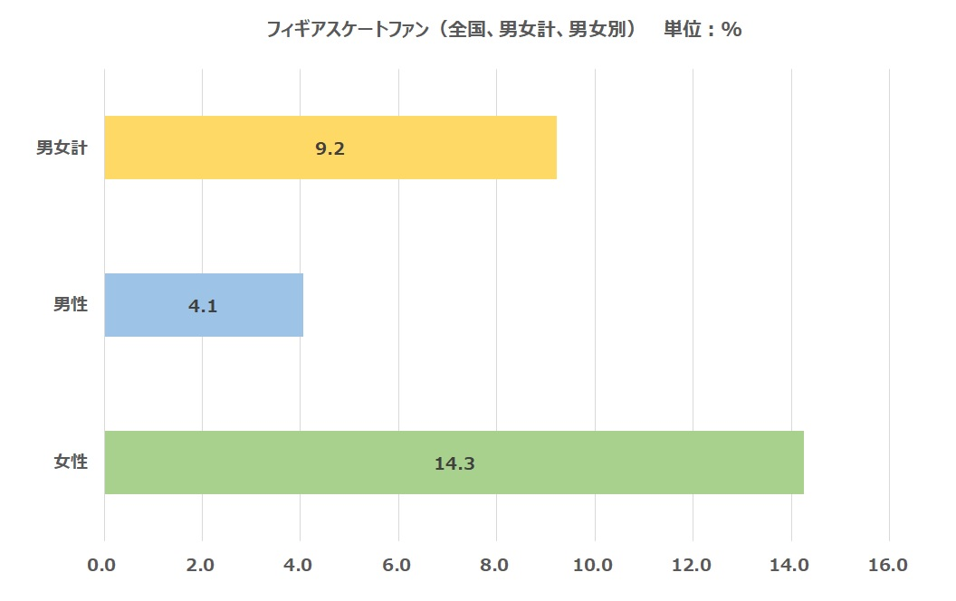特に冬の季節は寒くて外に出たくないもの。身体が冷たい風に吹かれるたびに、自分の体力が失われていく気になります。そのようなときは、自宅にこもってスポーツ観戦はいかがでしょうか。今年、冬に行われる世界大会で注目したいのが、フィギュアスケート。本調査結果によると、国内の人気スポーツとしてフィギュアスケートは上位に入っているスポーツです。フィギュアスケートファンは、全体で9.2%。うち、男性が4.1%、女性が14.3%と女性の割合は男性の3倍という結果になりました。