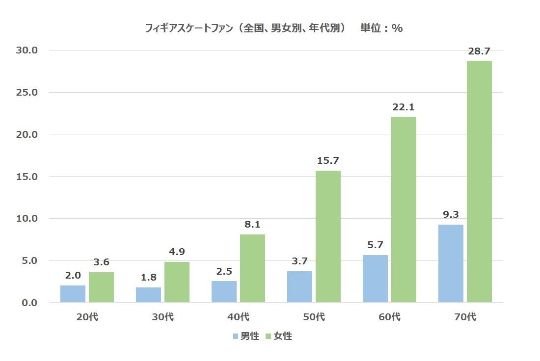 - フィギュアスケートファン層は、男性は60代から、女性は50代から大幅に増加