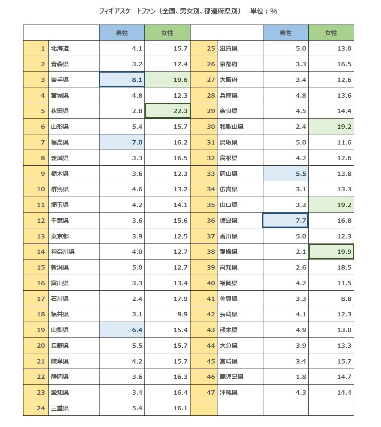 - フィギュアスケートファンが多い都道府県は? 男性1位岩手県、2位徳島県、女性1位秋田県、2位愛媛県
