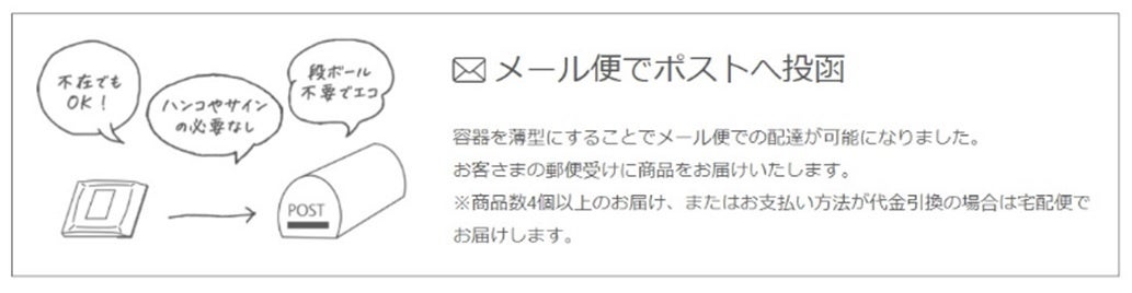 ・メール便対応の容器デザインで、配送にかかる環境負荷を低減しお客様の受取りも便利に