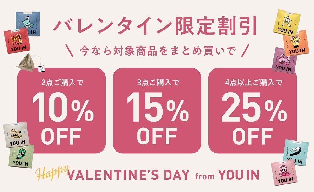 YOU INでは今回、対象商品を2点ご購入いただくと10%off、3点ご購入で15%off、4点ご購入で25%offとなる初のまとめ買いキャンペーンを実施します。バレンタインギフトを複数の方に贈りたい場合は、まとめ買いが大変お得ですので、この機会にご利用ください。