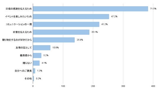 贈り物をする理由としては、「日頃の感謝を伝えるため」と回答された方が全体の71.5%で最も多いことが分かりました。バレンタインデーは、従来は「好意を伝える日」であった一方で、近年では近しい人への「日頃の感謝を伝える日」という位置づけになっていることがうかがえます。