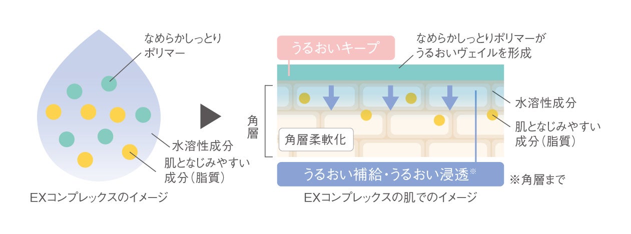「EXコンプレックス」が、厚く硬くなった角層になじみ、肌を柔軟化。角層深くまでうるおいを浸透させ、肌表面にうるおいヴェイルを形成することで、ハリ感を感じるしっとりとした肌をキープします。