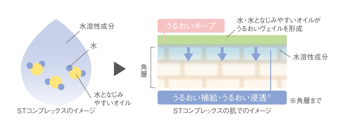 「STコンプレックス」が、角層深くまでうるおいを浸透させ、肌表面にうるおいヴェイルを形成することで、しっとりとした肌をキープします。