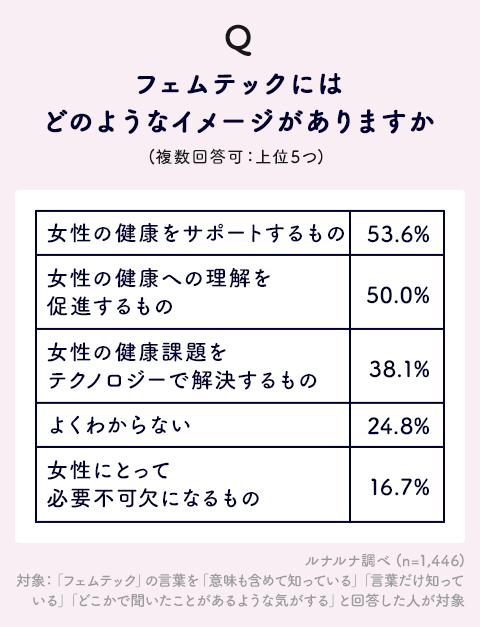 女性の健康課題をテクノロジーで解決する商品・サービスを指す「フェムテック」ですが、新しい概念のため定義もイメージも様々です。そこで、ルナルナユーザーたちはフェムテックにどのような印象を持ち活用しているのか、また不安や疑問に思っていること、期待していることについて詳しく調査しました。今カラダやココロに何らかの悩みを抱えている一人でも多くの女性が、フェムテックに触れるきっかけとなることを期待します。