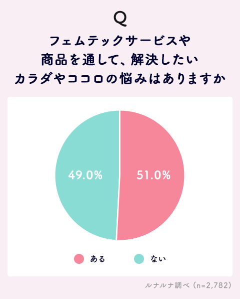 最後に、フェムテックを通して解決したいカラダやココロの悩みがあるかをたずねると、「ある」51.0%と、過半数の人が何らかの悩みを抱えていることが明らかになりました。