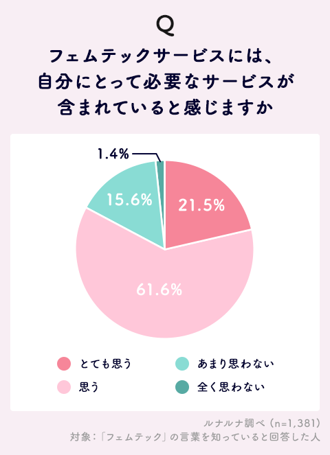 このようなフェムテックサービスについて、自分にとって必要なものが含まれていると思うかをたずねると「とても思う」21.5%、「思う」61.6%となり、合計すると8割以上の人がフェムテックサービスは必要だと感じていることがわかりました。
