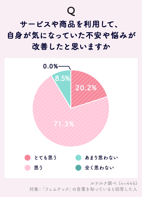 さらに、フェムテックサービスや商品を利用し自分の不安や悩みが改善したと思うかをたずねると「とても思う」20.2%、「思う」71.3%となり、合計するとなんと9割以上の人がフェムテックによって悩みや不安が改善されたと答えました。これは、フェムテックをよくわからないと思っていたり、なんとなく敷居の高いイメージを持っている人にとっても期待の持てる結果ではないでしょうか。
