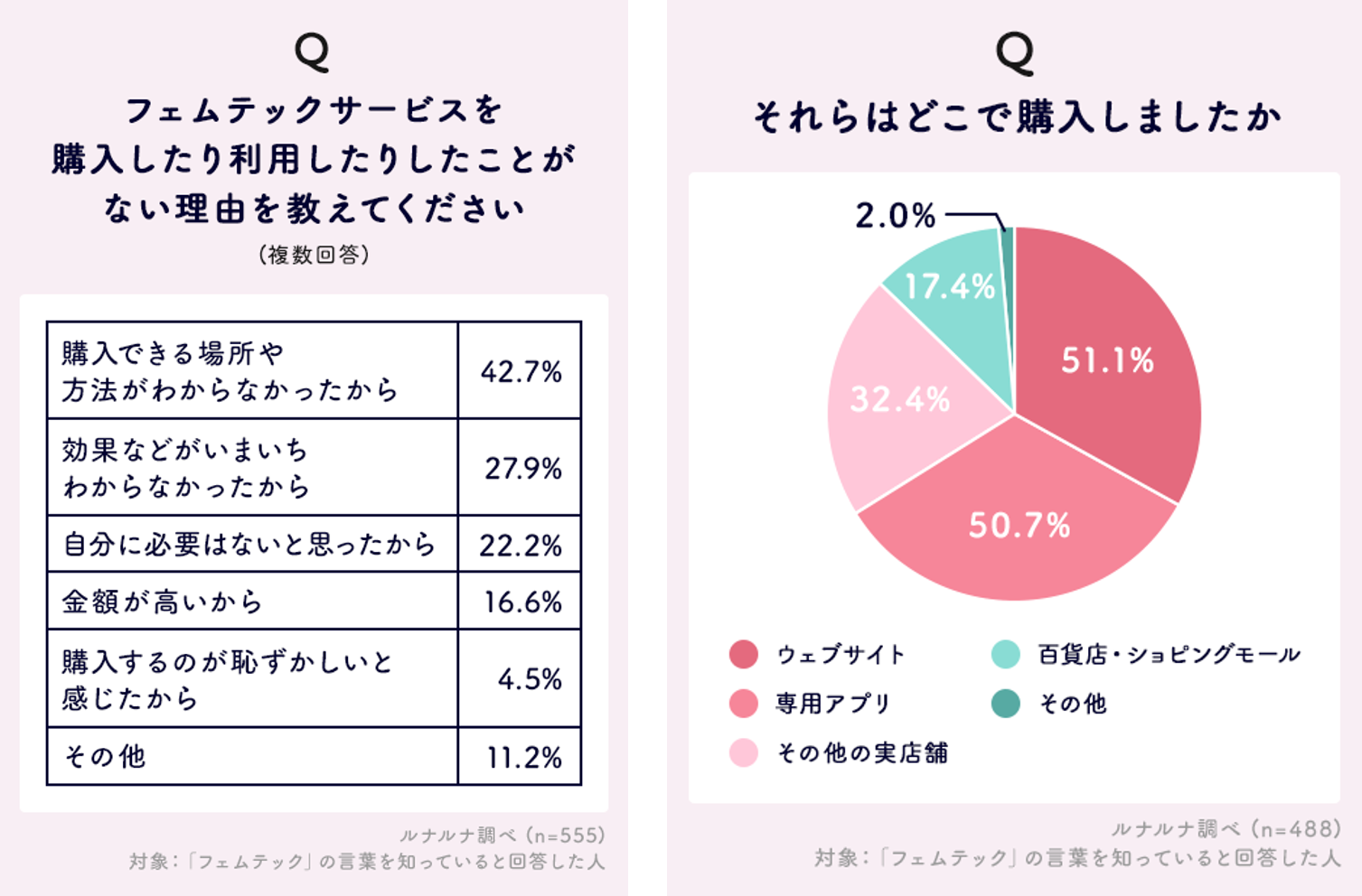 ■ フェムテックサービスの壁は、購入方法・場所の複雑さ?過半数が、サイトやアプリで購入。