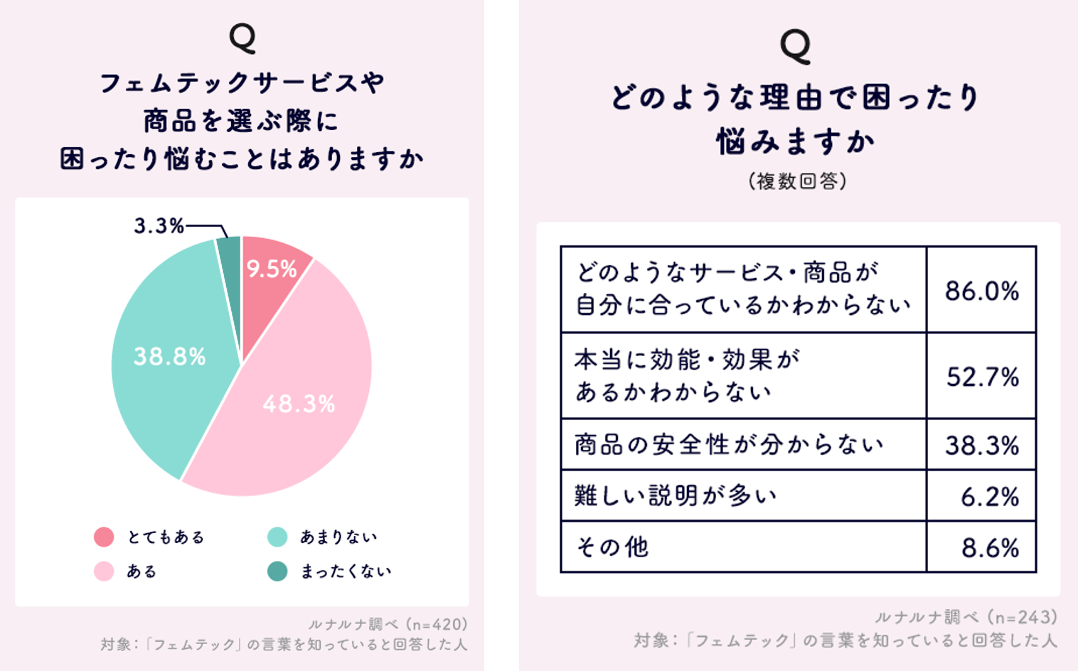 Q. フェムテックサービスや商品を選ぶ際に、困ったり悩むことはありますか。/Q. どのような理由で困ったり、悩みますか。(複数回答)