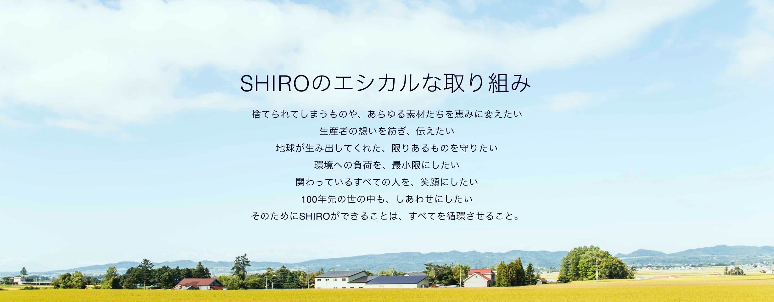 「自分たちが毎日使いたいものをつくる」というシンプルな想いからスタートしたコスメティックブランド。自社内に開発から販売まですべての機能を持ち、創業当初からエシカルな信念に基づくものづくりを続けている。国内外から見つけ出した、厳しい自然が育んだ素材のちからを最大限に引き出すスキンケア、コスメ、フレグランスを提案。日本全国に展開する直営店の他、ロンドンにも出店。製品に使う素材同様、厳選した食材を届ける食のセレクト [SHIRO LIFE]、素材のおいしさを料理で伝えるカフェ[SHIRO CAFE]、SHIROが提案する美しさを最大限体感できるサロン[SHIRO BEAUTY]などの業態も展開。
