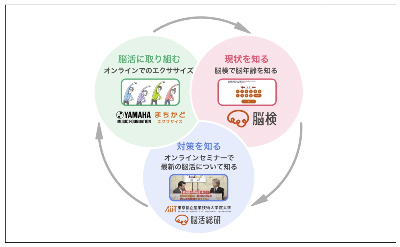 この度、ヤマハ音楽振興会制作による、認知機能に確かな効果が実証されているプログラム「まちかどエクササイズ」をオンラインにて実施することで、脳活に良いエクササイズに自宅で取り組め、脳検で定期的に認知機能をチェックもできる「脳活性プログラム」の提供を開始いたしました。