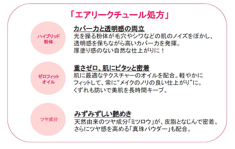カバー力と透明感の両立、軽やかな密着感、そしてみずみずしい艶めき。独自の「エアリークチュール処方」で、エイジングノイズを瞬時に隠しながらも重さはゼロ。洗練肌が続く究極のクッションファンデーション。