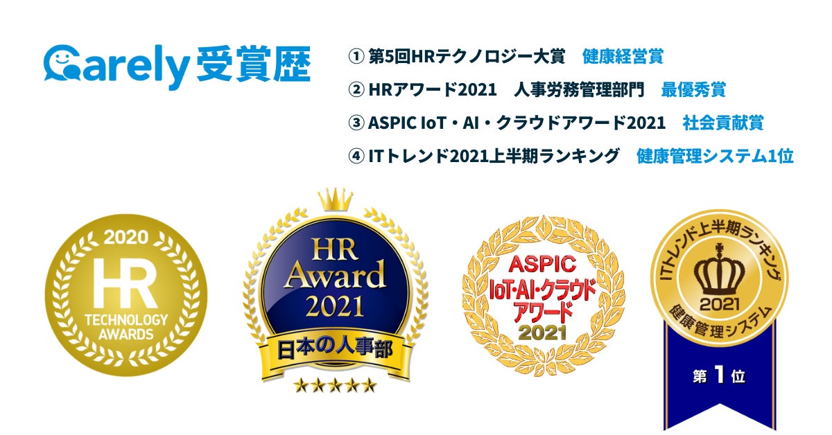 また社会的な健康経営の機運の高まりとCarelyのこれまでの実績により、全国27万人のHRパーソンの投票から、「HRアワード2021」(主催:日本の人事部、後援:厚生労働省)人事労務管理部門において、Carelyが最優秀賞を受賞するに至っています。