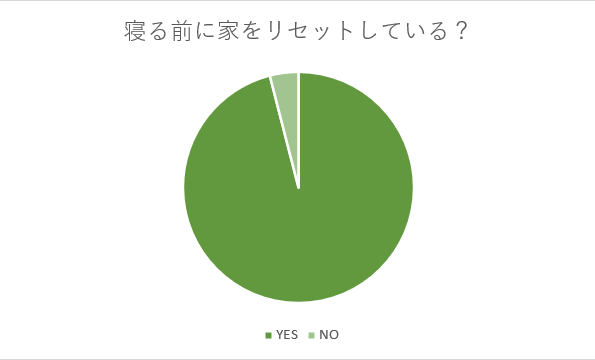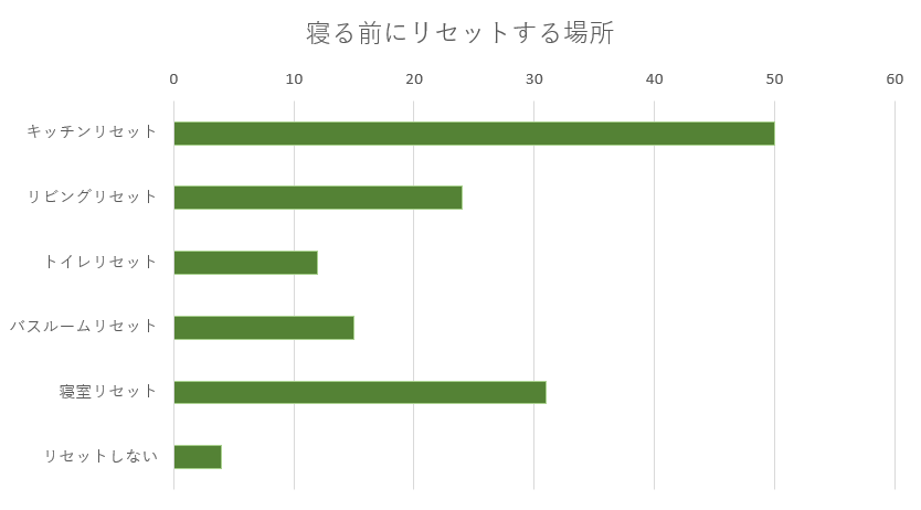 次に多かったのが寝室リセットで31人。整えてから寝る方々です。そして、リビングリセット、バスルームリセットと続きます。逆にリセットを何もしない人は4%。散らかったままでも体力温存を優先してしまうのかもしれません。決して責められるわけではなく、夜はみんな疲れていますから、ゆっくり片付けをしている余裕がない方もいらっしゃるのです。