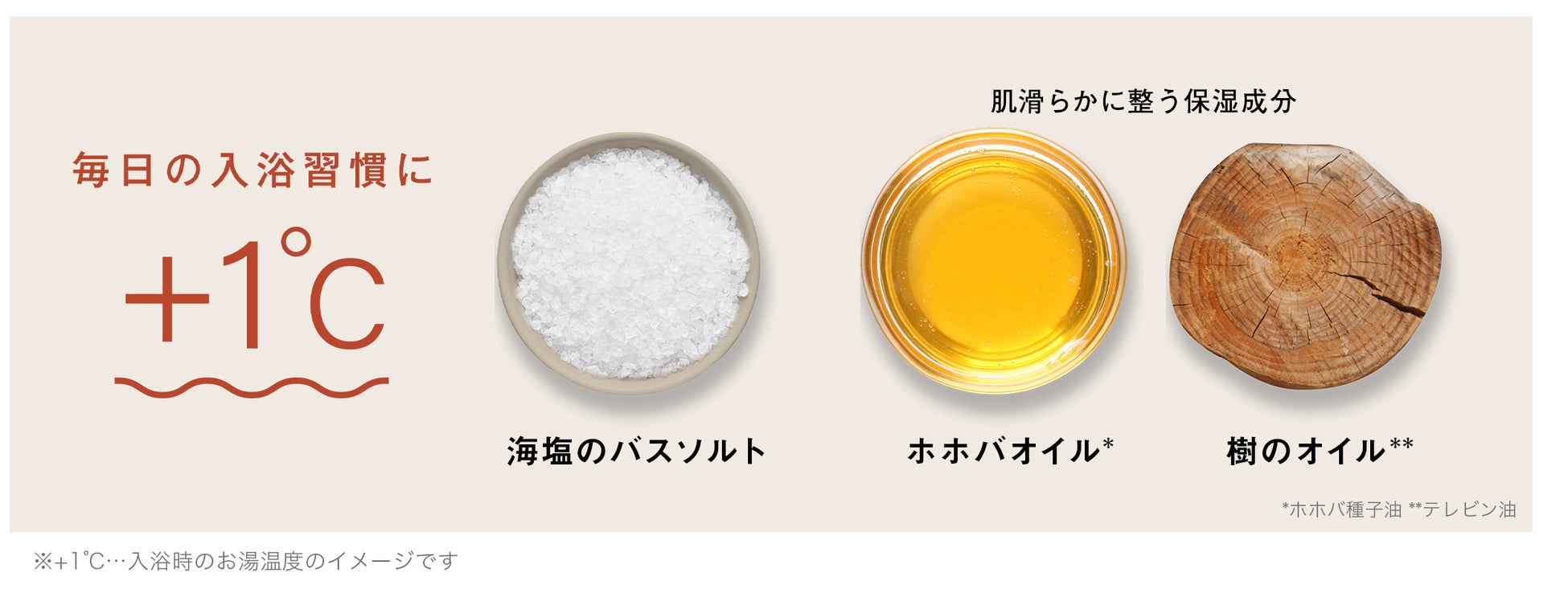 海塩*に植物由来のオイル成分**を配合。炭酸Naや植物由来のセルロースガムを配合することで肌ざわりの良い柔らかなお湯によりお肌を整えます。