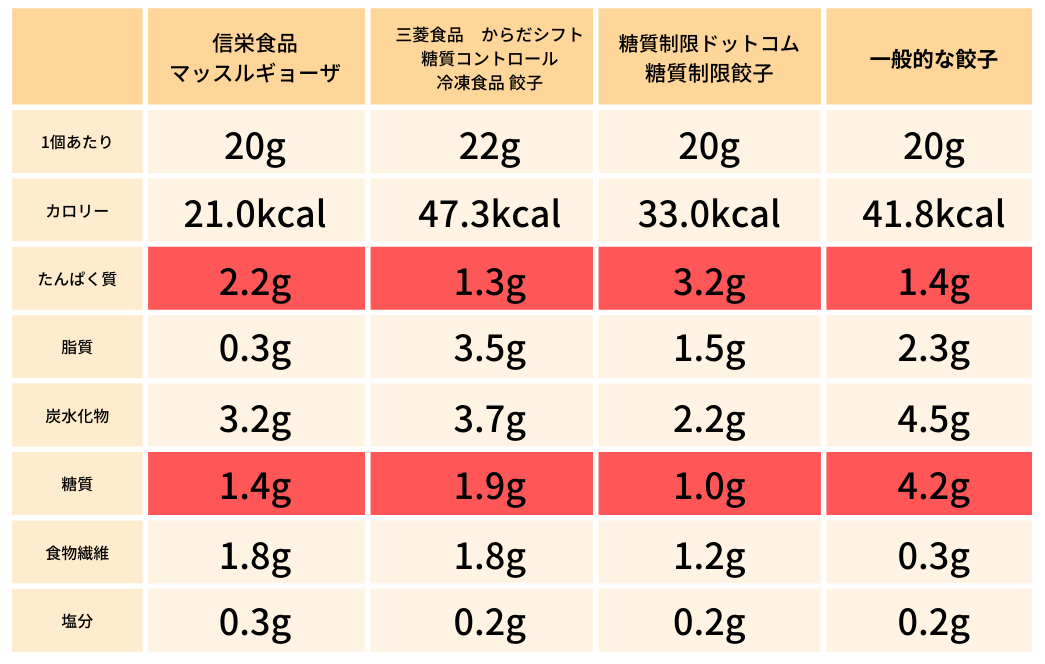 また近年は、3位にランクインしている「信栄食品マッスルギョーザ」のような糖質の制御をした上で、しっかりたんぱく質がとれる餃子の人気が上がってきています。「信栄食品マッスルギョーザ」「三菱食品 からだシフト糖質コントロール 冷凍食品餃子」「糖質制限ドットコム糖質制限餃子」の3商品と、通常の餃子の栄養素を比較した右の表を見ると、糖質が1/2〜1/4まで抑えられていることが分かります。他にも脂質が抑えられている商品もあり、摂取したい栄養素や制御したい栄養素等を自らでコントロールしながら餃子を楽しめるようになってきています。