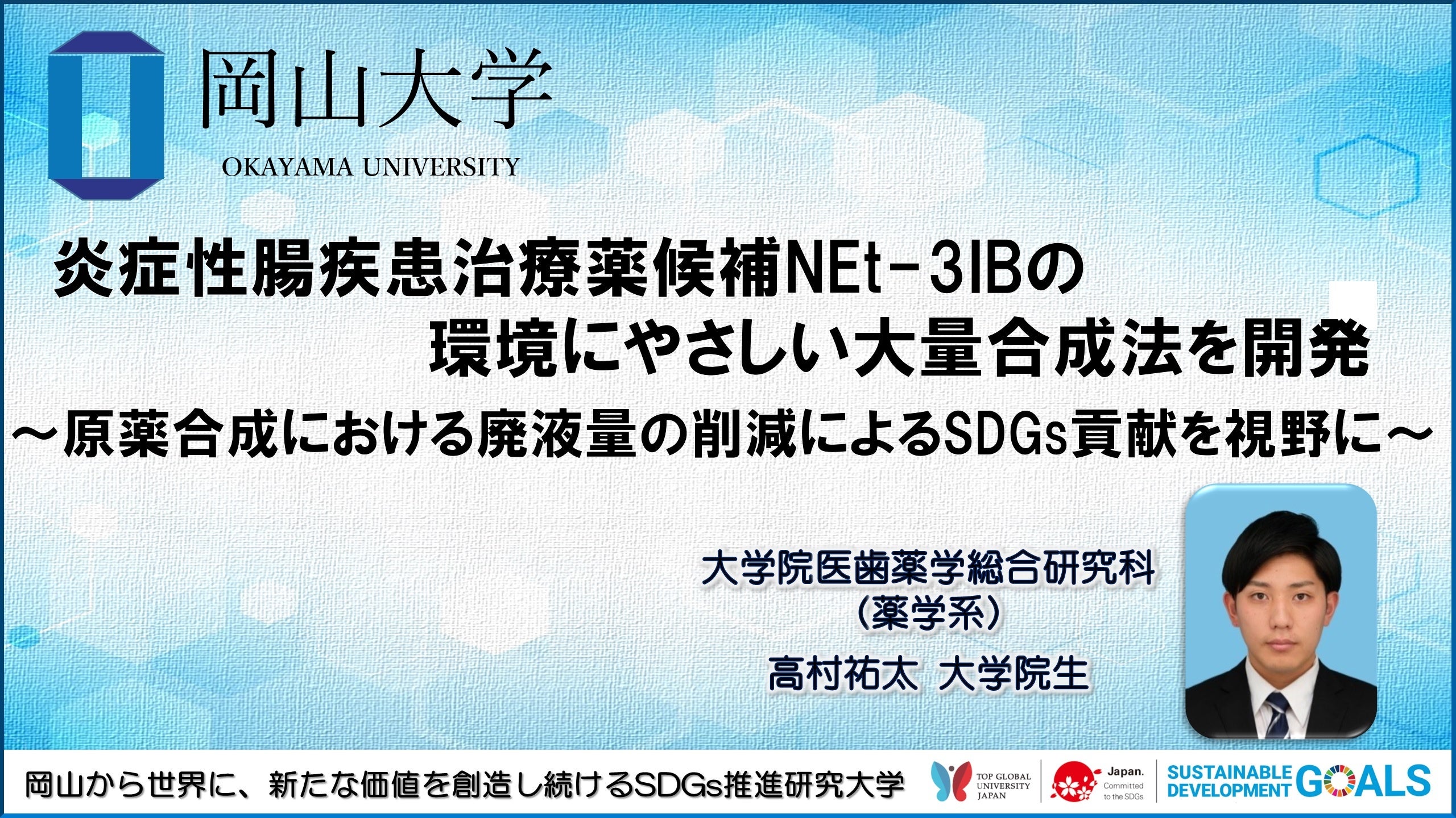 - 本研究では、岡山大学発の低分子型IBD治療薬候補NEt-3IBの大量かつ安定供給が可能な大量合成法の開発に成功し、本成果によりNEt-3IBの医薬開発が促進されると期待されます。