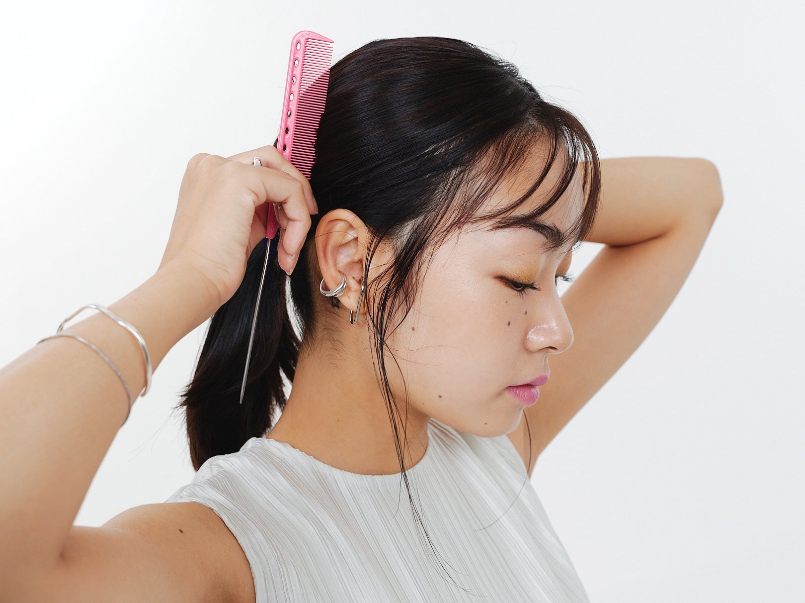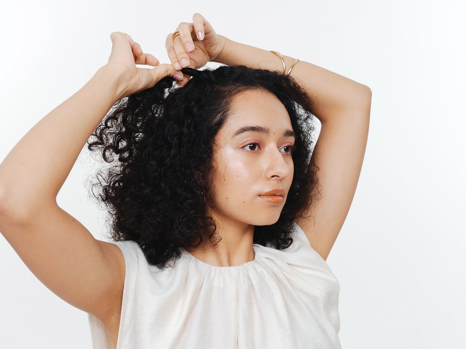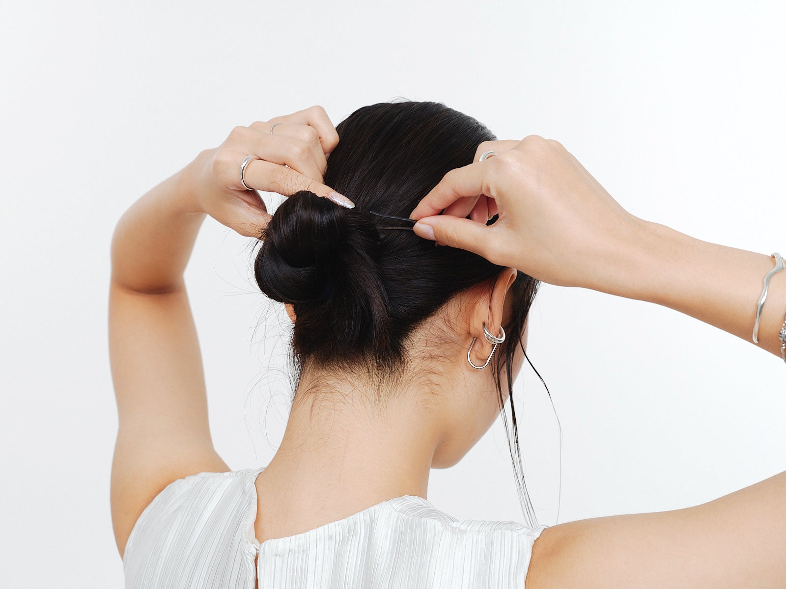 髪を結んでまとめることで、うねったり広がったりするのを防ぎます。「シャインモイスト」タイプを使用することで、パサつきを抑えながら、スタイリングできます。