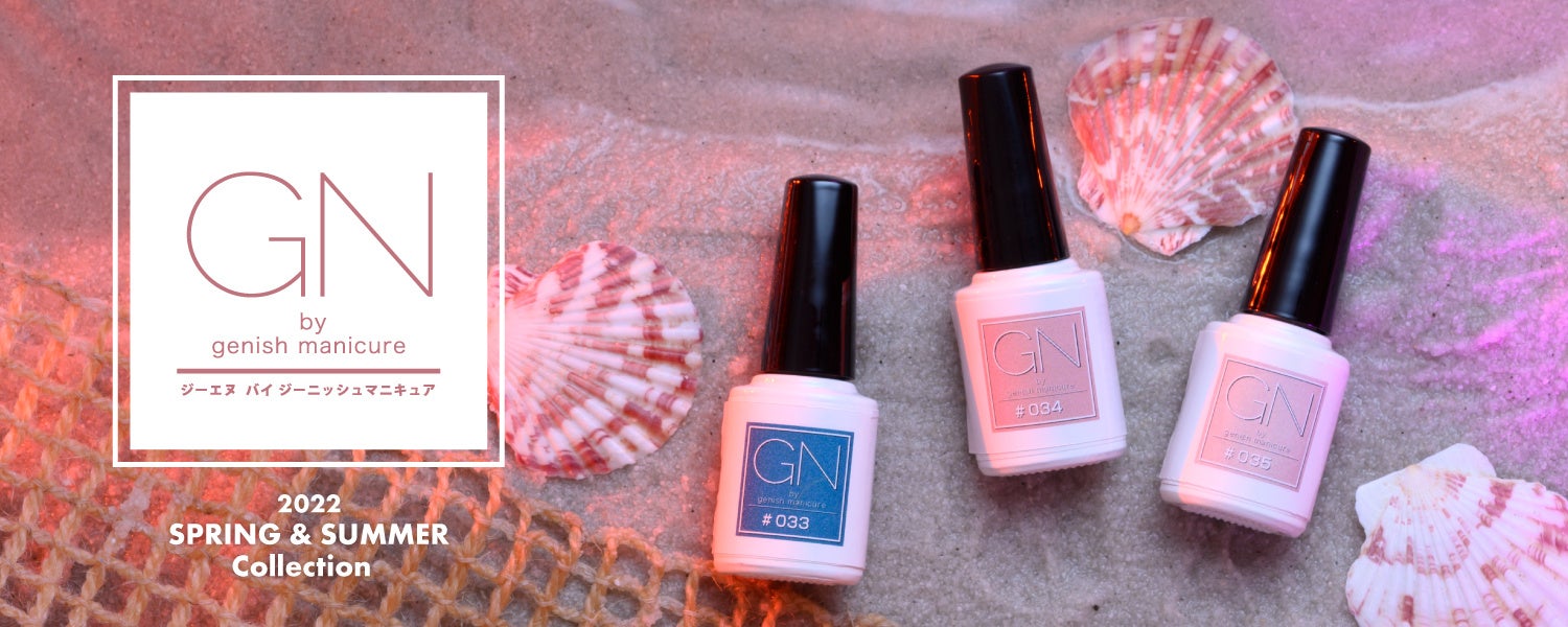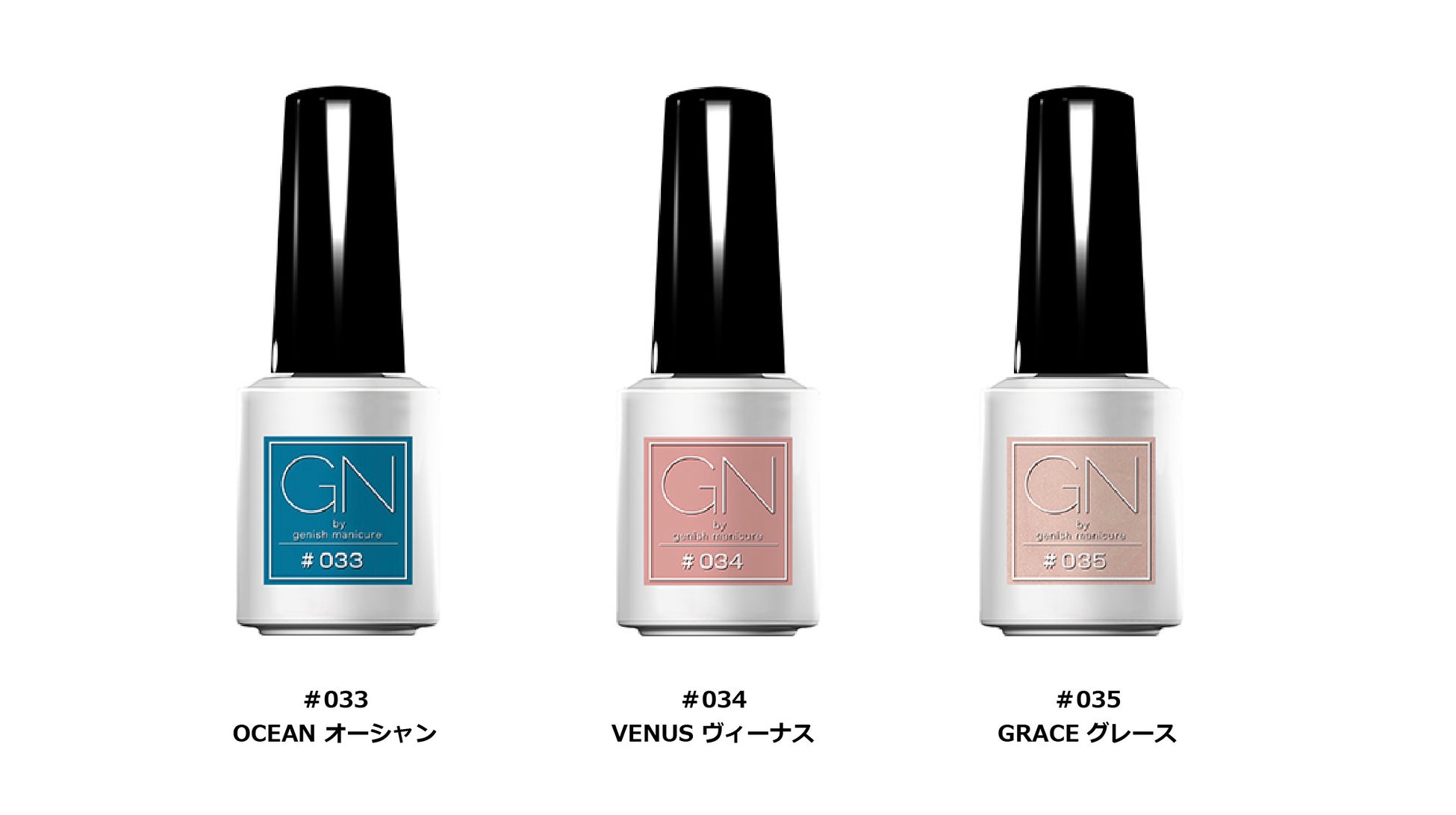 ジェルネイル成分*配合の60秒速乾マニキュア『ジーエヌ バイ ジーニッシュマニキュア』から春の新色が登場します。この春、新発売する3色は、サンセットビーチを連想させる、ロマンチックでときめくようなカラー展開です。繊細なブルー&グリーンラメが特徴のシアーブルー「#033 オーシャン」。肌を綺麗に見せるゴールド&ブルーラメが可愛い大人ピンク「#034 ヴィーナス」。ピンクラメが優雅に煌めくこなれベージュ「#035 グレース」。3色とも単色塗りはもちろん、定番カラーとも相性のいい万能カラーです。                     *光硬化樹脂