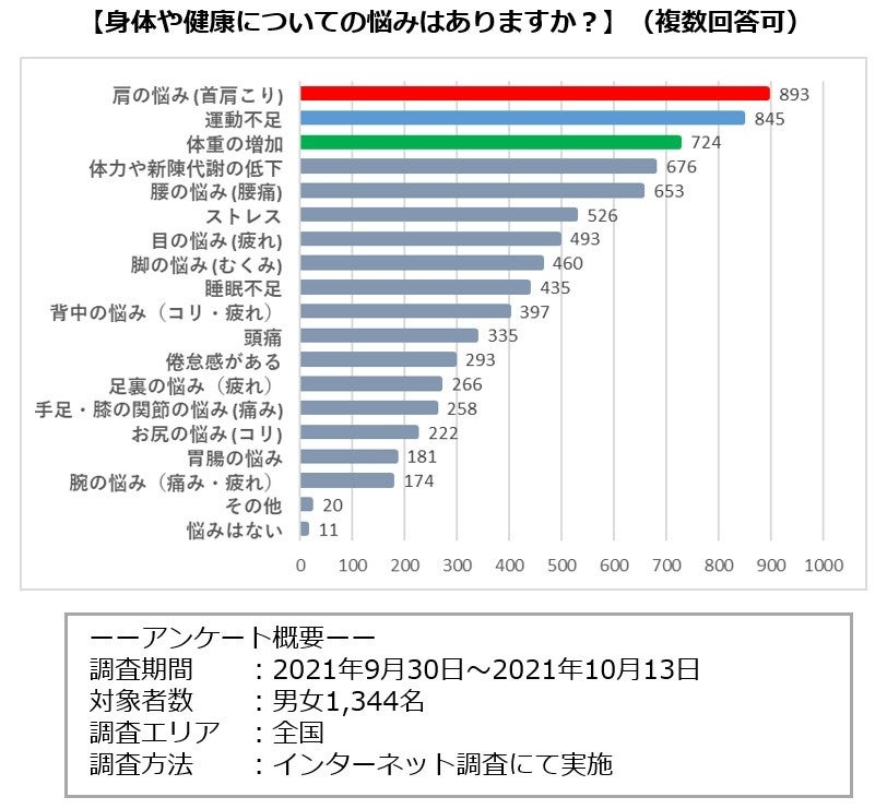 『ドクターエア』では2021年に一般消費者1,334名を対象にインターネット上にて健康意識に関するアンケートを実施。アンケートで「身体や健康についての悩みはありますか?」という問いに対して、約67%の方が首、肩のこりに悩んでいると回答。新型コロナウイルス感染拡大防止に伴った長期の行動規制による生活環境の変化や運動不足など様々な要因から、首や肩への不調を感じている人が増加傾向にあると推定できる結果になりました。