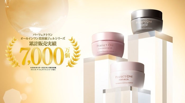※1 パーフェクトワン オールインワン美容液ジェルシリーズ累計販売実績2006年5月~2022年2月(ラフィネ パーフェクトワンシリーズ含む) ※2 富士経済「化粧品マーケティング要覧2017~2021」(モイスチャー部門およびオールインワン部門/メーカー、ブランドシェア2016~2020実績)