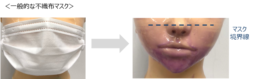 マスクを透過する紫外線の影響を、紫外線で紫色に変わる塗料をぬったマネキンで実験してみました。紫外線を一定時間当てると、マスクの下は紫色に変化しており、マスクをしていても紫外線を透過していることが分かります。一般的な不織布マスクは、約20%~25%もの紫外線を透過しています。※1