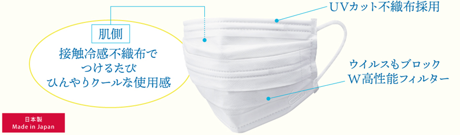このような背景から、UVカット率94%、紫外線から肌をしっかり守れる大きめ形状の冷感不織布を使用したつけるたびひんやりクールな使用感の「冷感UVカット マスク 不織布タイプ」を発売します。