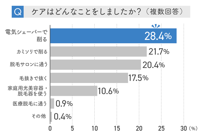 多くの方が気にしている指の毛ですが、ムダ毛ケアをしたことがあるか聞いてみると「95%以上の方がケアをしたことがある」と回答。ムダ毛ケアの方法としては「電気シェーバーで剃る(28.4%)」、「カミソリで剃る(21.7%)」が上位となり、自己処理をしている方も多いことが分かりました。また、「脱毛サロンに通う(20.4%)」、「医療脱毛に通う(0.9%)」などと、プロに任せる方も一定数いるようです。