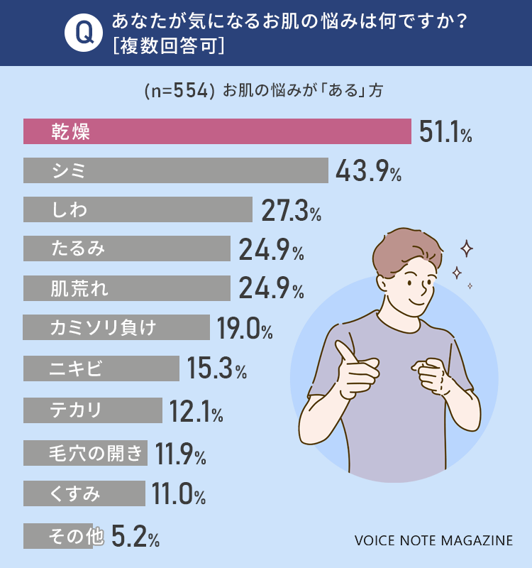 51.1%と半数以上の方がお肌の「乾燥」について悩んでいるようです。